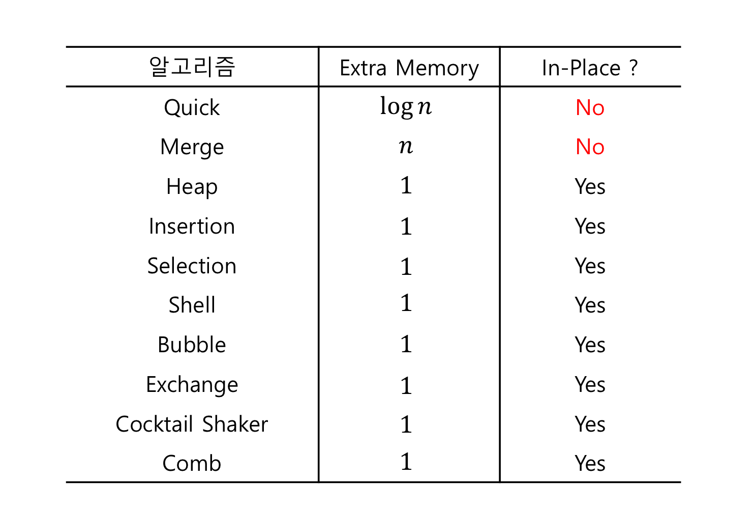In-place(제자리) 알고리즘이란 입력 데이터를 저장하는 메모리 이외는 상수 크기의 메모리만 필요한 알고리즘을 의미한다.
