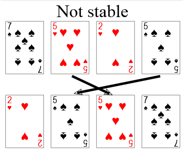 입력값으로 동일한 값이 2개 이상이 들어오는 경우도 존재하는데, 이때 입력된 순서가 정렬 이후에도 유지된다면 해당 정렬은 Stable(안정적)이라고 말하며, 순서가 달라질 수 있다면 불안정(Not Stable)하다고 말한다.