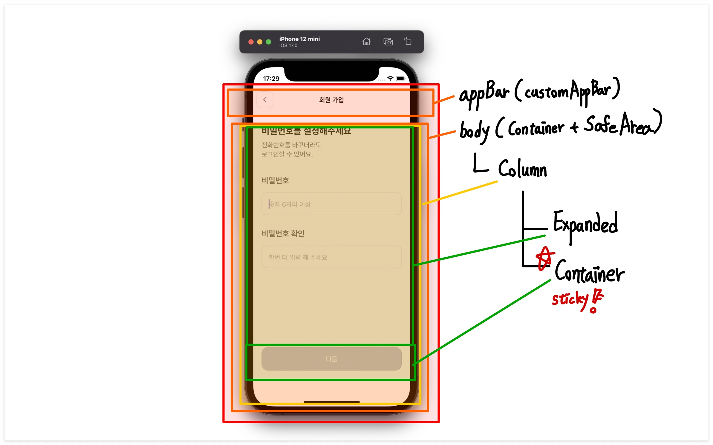 위 템플릿을 통하여 하단 sticky UI 패턴을 적용시킨 스크린의 모습입니다. 이해하기 쉽도록 위젯 트리의 계층별로 구분하여 나타내었습니다. Column을 통하여 Expanded(스크롤 가능 영역), Container(sticky한 영역)을 묶는 것이 템플릿의 핵심입니다.