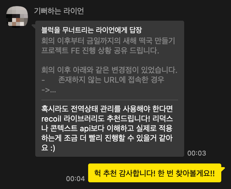 React를 이용한 첫 API 연결, 상태 관리, 배포 프로젝트였던 떡국 만들기 프로젝트에서 사용한 Recoil이어서 그런지 더욱 애정이 가는 것 같습니다. 다음에 React 프로젝트를 진행할 때에는 Recoil 사용도 고려해보면 좋을 것 같네요 :)
