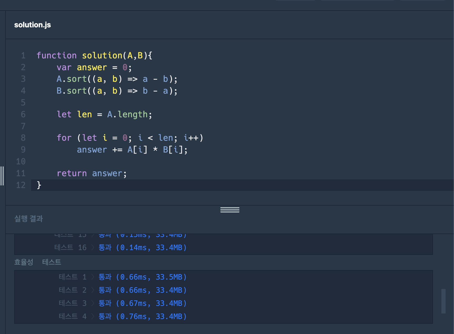 정답 코드와 위 실패 코드는 크게 다르지 않습니다. 차이점으로는 A는 오름차순, B는 내림차순으로 정렬시킨 뒤, 배열 A와 B 모두 index인 i 를 통하여 접근하는 것을 볼 수 있습니다.